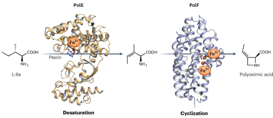 氮杂环丁烷作为药物研发领域的“明星药效团”,在抗肿瘤、抗病毒等药物设计中具有不可替代的价值。然而,该结构高达约25 kcal/mol的环张力,使其化学合成需依赖预活化底物、多重保护基或剧烈反应条件,故极大限制了其在药物研发中的广泛应用。自然界中含氮杂环丁烷结构的天然产物如何在温和条件下完成这一高能垒转化,已成为长期科学之谜。前期联合团队率先破解了氮杂环丁烷生物合成的“双酶协同”逻辑,即:金属酶PolE与PolF以L-异亮氨酸为起始底物,通过级联反应高效构建氮杂环丁烷。相关成果以“A two-metalloenzyme cascade constructs the azetidine-containing pharmacophore”为题发表于《Nature Chemistry》(DOI: 10.1038/s41557-025-01949-y)。