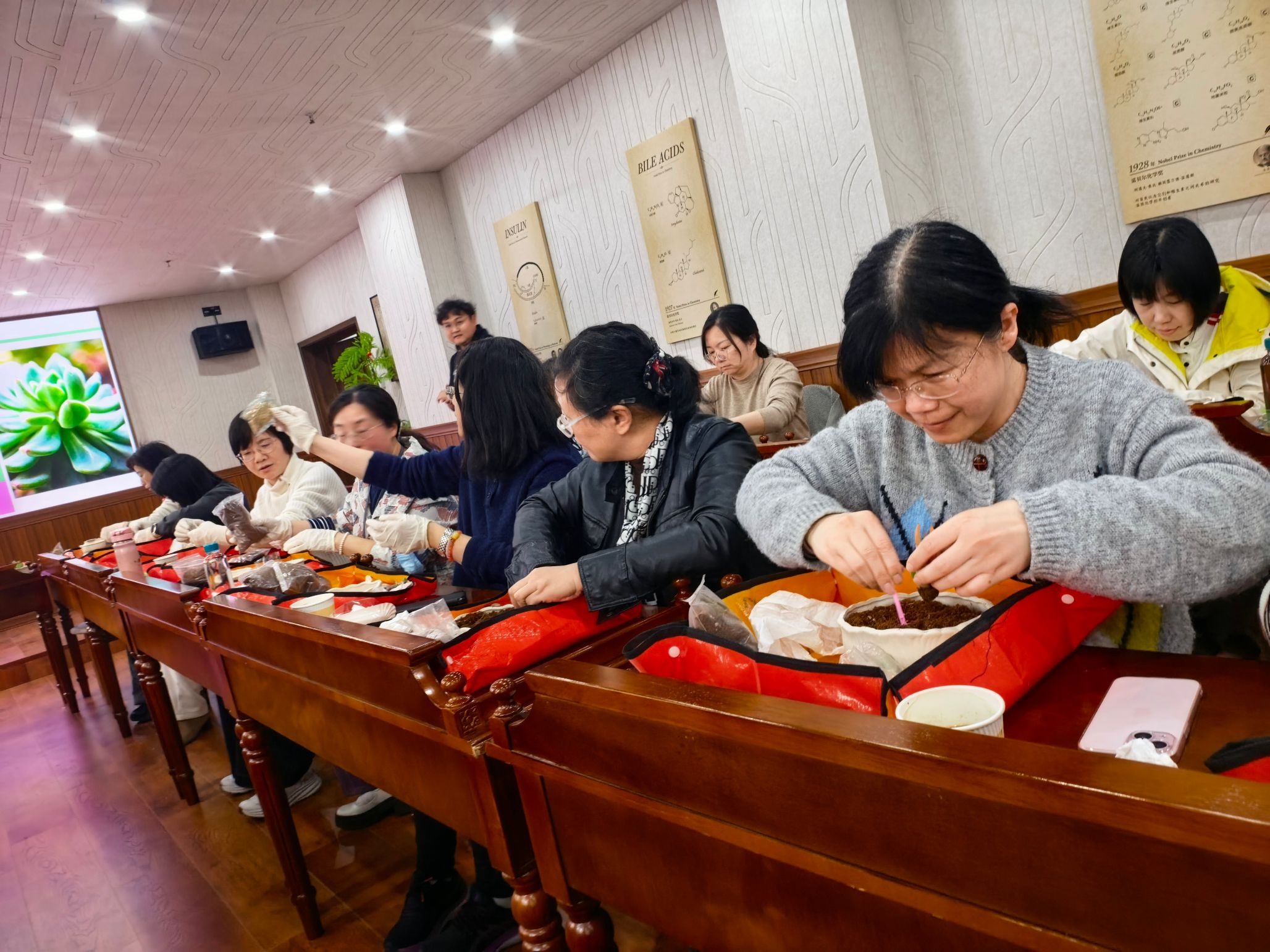 在动手制作环节,女老师们将园艺师精心准备的各种各样、圆滚滚、肉嘟嘟的多肉宝宝进行自由搭配,亲手把这些萌萌的小生命种进铺有五彩石、可爱的小花盆里,并搭配一些创意装饰,创作出属于自己的、独一无二的盆栽作品。通过制作,感受指尖触碰泥土的治愈,看着它们慢慢舒展叶片的生机,体会动手种植的乐趣。
